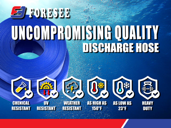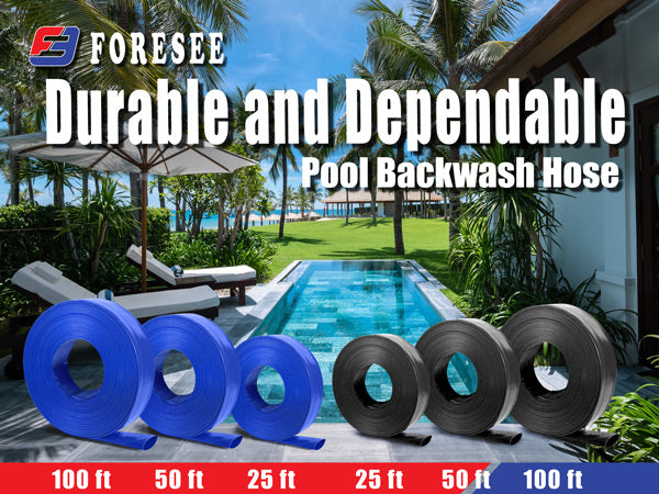 The Foresee PVC discharge/backwash hose is available in two colors, black and blue, and offers a range of diameters from 1 to 3 inches. It comes in lengths of 25, 50, and 100 feet, providing versatile options for various applications. The Foresee hose is backed by a 1-year warranty from Foresee, giving customers peace of mind.