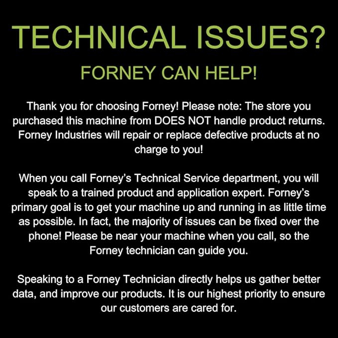 Thank you for choosing Forney! Please note: The store you purchased this machine from DOES NOT handle product returns. Forney Industries will repair or replace defective products at no charge to you!